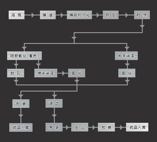 熔煉:主要原材料AL99.70以上鋁錠(GB/T1196)加入鋁硅合金錠、鎂錠加熱熔煉、熔煉溫度為730℃~750℃、進行攪拌、精煉、打渣等工序。